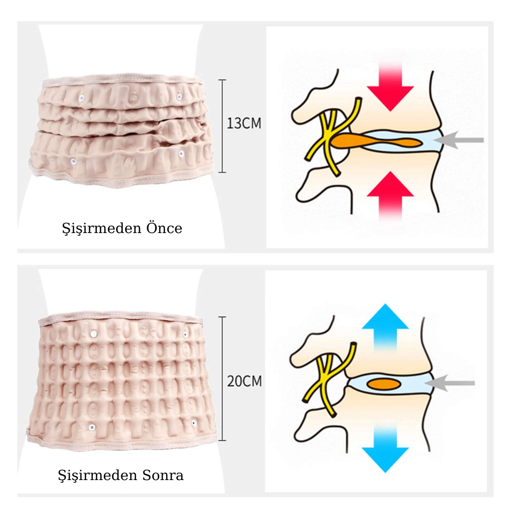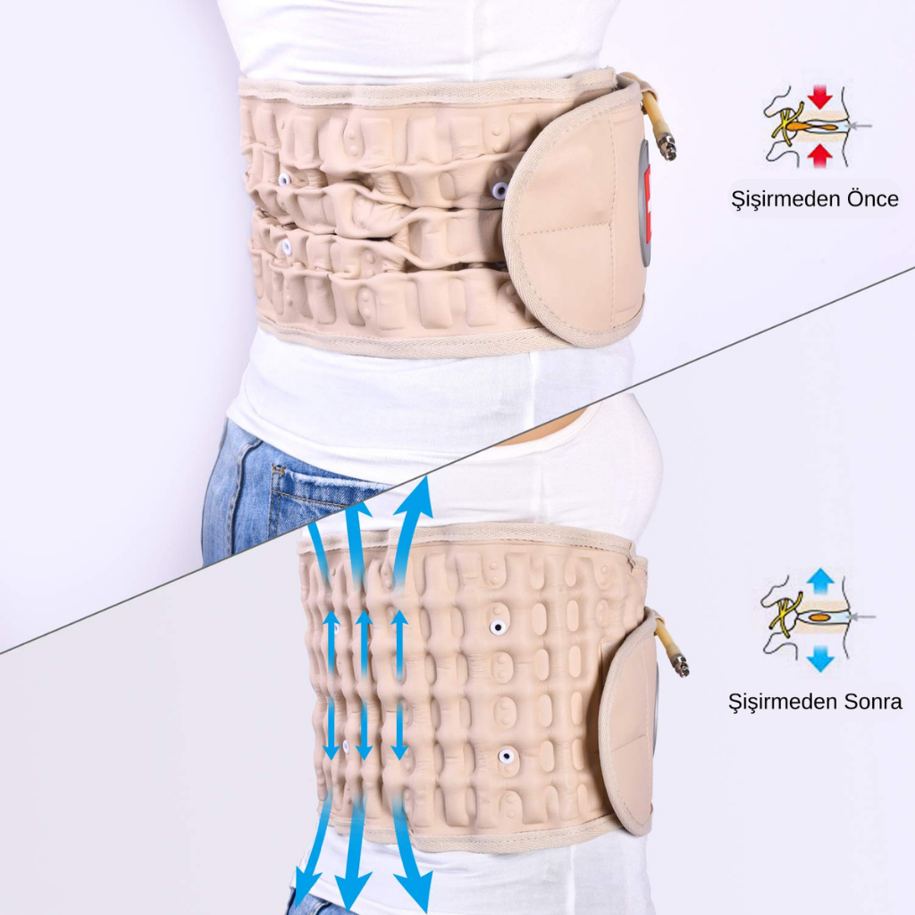 Dekompresyon kemerini belinize sarın ve rahat bir uyum için ayarlayın. Sırtınızda hafif bir gerginlik ve rahatlama hissedene kadar kemeri şişirmek için ürünle birlikte verilen pompayı kullanın.